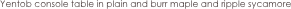 • Portfolio • Miscellaneous • College and university • Reception desks • Office fitted furniture • Conference tables • Domestic fitted furniture • Desks • Cabinets and bookcases • Upholstered seating • Side and occasional tables • Tables and chairs • Side and occasional tables Yentob console table in plain and burr maple and ripple sycamore